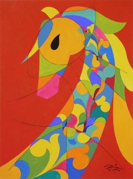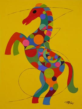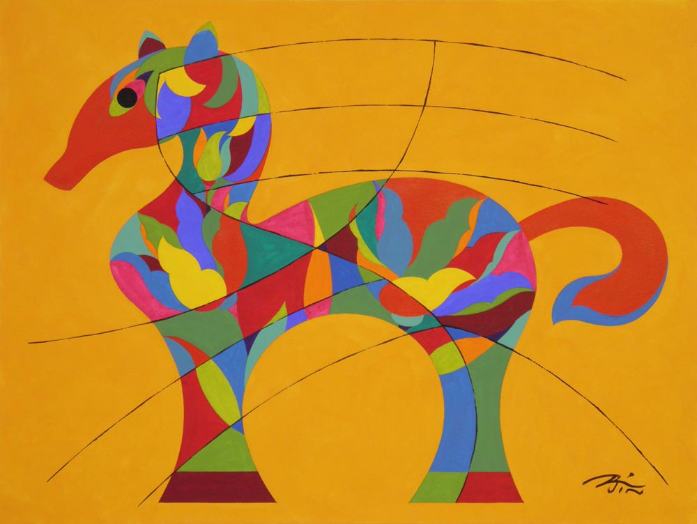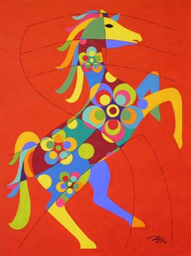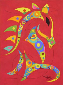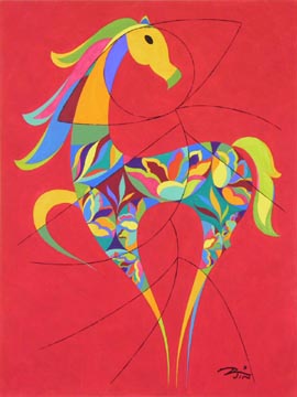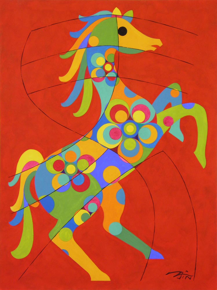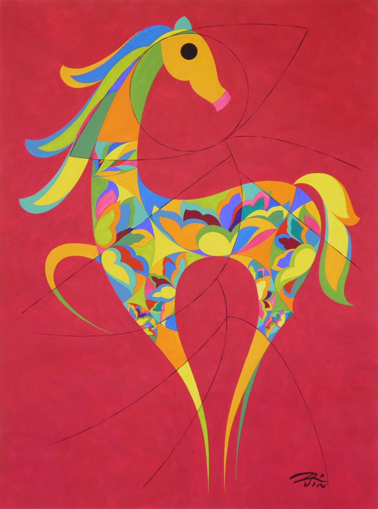 Each year since the Year of the Rabbit in 2011, New York artist Peiliang Jin has commemorated the Chinese New Year for the World Journal by creating unique animal watercolor paintings of the Chinese zodiac. When approached by the World Journal, he knew he wanted to incorporate in the finished work a wide variety of traditional and modern art forms from Chinese, European and American traditions. Each watercolor includes elements of calligraphy, seal cutting, oil and watercolor painting, sculpture, wood and paper cutting, embroidery, wall painting, ceramics and porcelain decoration. For the background, he uses one of the 12 unique colors in the 12-Color Wheel and each zodiac image is painted using 17 other different colors. For the Year of the Horse in 2014, as in prior years, a different representation of the Chinese character for "horse," taken from history and literature, is used for each illustration, adding to the authenticity of the images. | ||